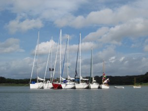 From left to right: Pat & Dave on Va Bene, Robert & Tasha on their latest Beneteau 34, Bay on Red Sky, Tony & Michelle on Caribbean Run, Joe & Alex on Prelude, Marty, Sue & Koko on Caribbean Hug, and Monte & me on Cupholder. The sailing dinghy on the far right is our homebuilt Porter Belle.