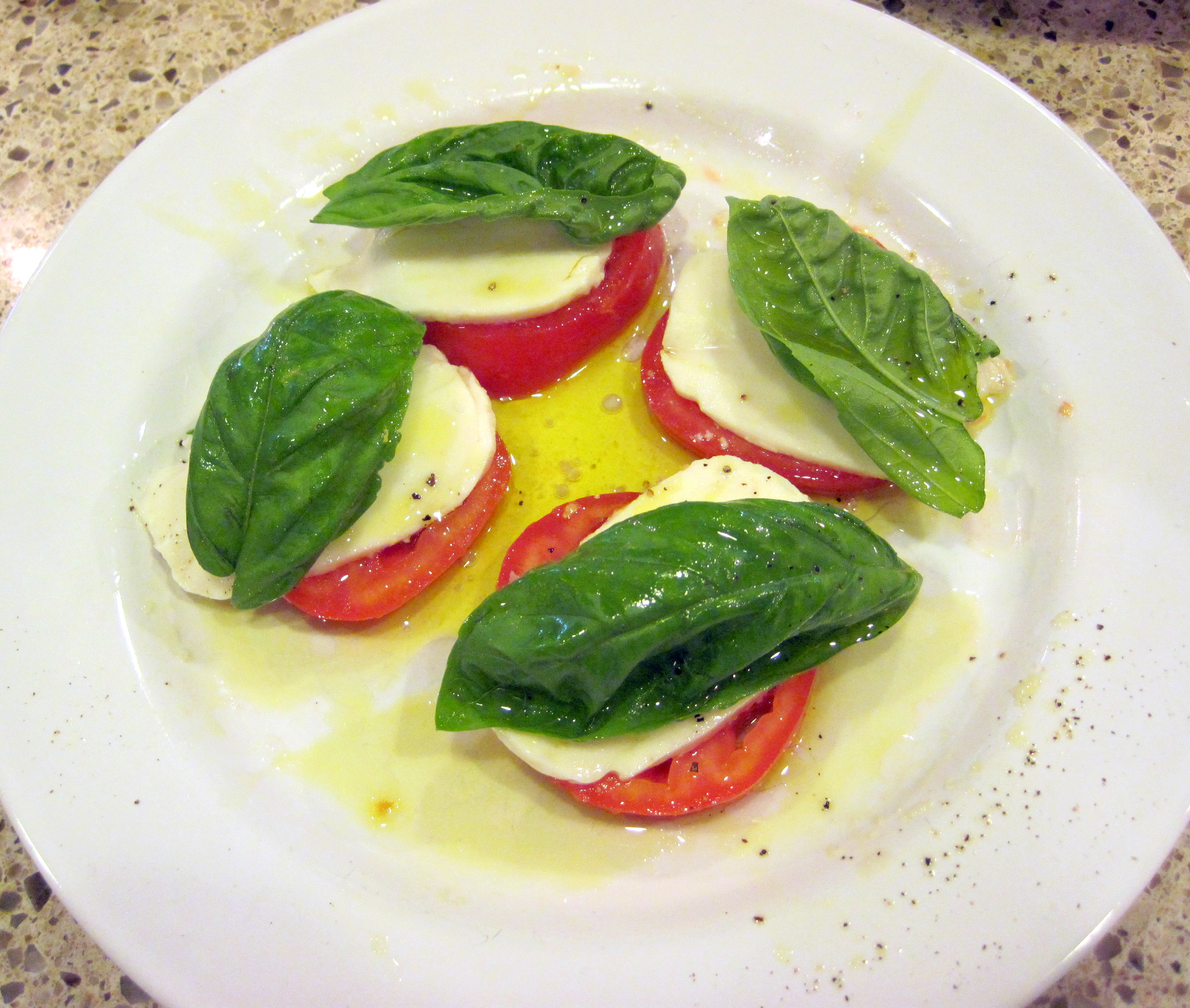 Monte made dinner tonight. This is a shot of the lovely caprese salad appy, with homegrown basil. We’ve really been enjoying the bumper crop of basil — putting it in as many dishes as we can. Main course was Rainbow Trout ala Monte…. delicious!