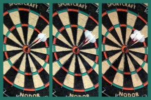 Friday night. Must be dart night. While Monte was warming up at home I took some photos of the board. This sequence of three throws ended up being double-bull, bull, bull. Those of you that have played darts with Monte will believe me that this was not staged. 🙂