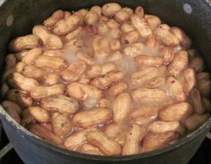 You start with pound of green peanuts. Wash them well and soak in cold water for about 30 minutes. Drain and put in boiling pot with about 2 quarts of water and 1/2 cup salt and boil for about 4-5 hours.