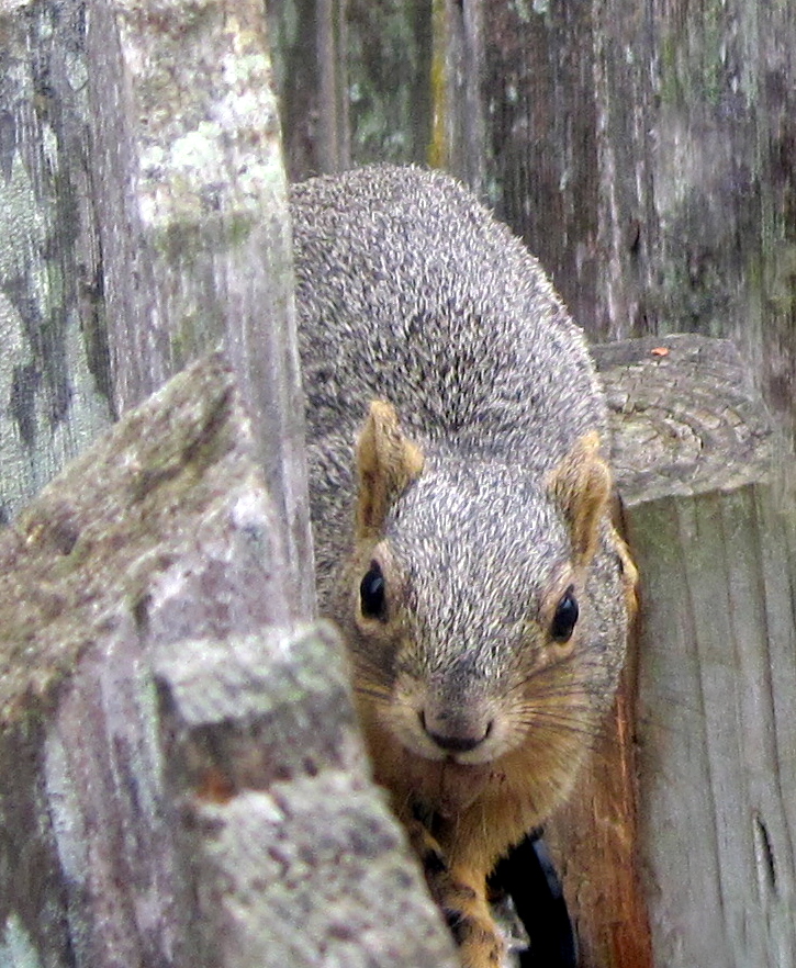 Hectic first day back. But a canceled noon meeting meant that Monte and I could go to lunch together, so we did. As we were leaving I spotted a squirrel hiding on the fence. He didn’t run away until after I had taken this shot. If you look closely you can see a huge pecan in his mouth.