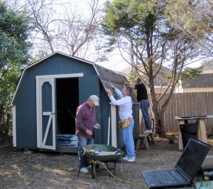 Big day at the homestead. As monte said…. we assembled a crack crew of computer professionals to reroof the little garden shed out back.