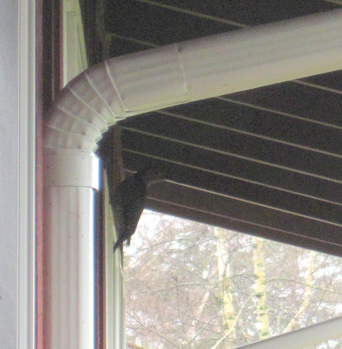 This afternoon I kept hearing a knocking on the wall that sounded like a woodpecker. I snuck around the outside of the house and caught a grainy shot of the varmit by sticking my camera around the corner.