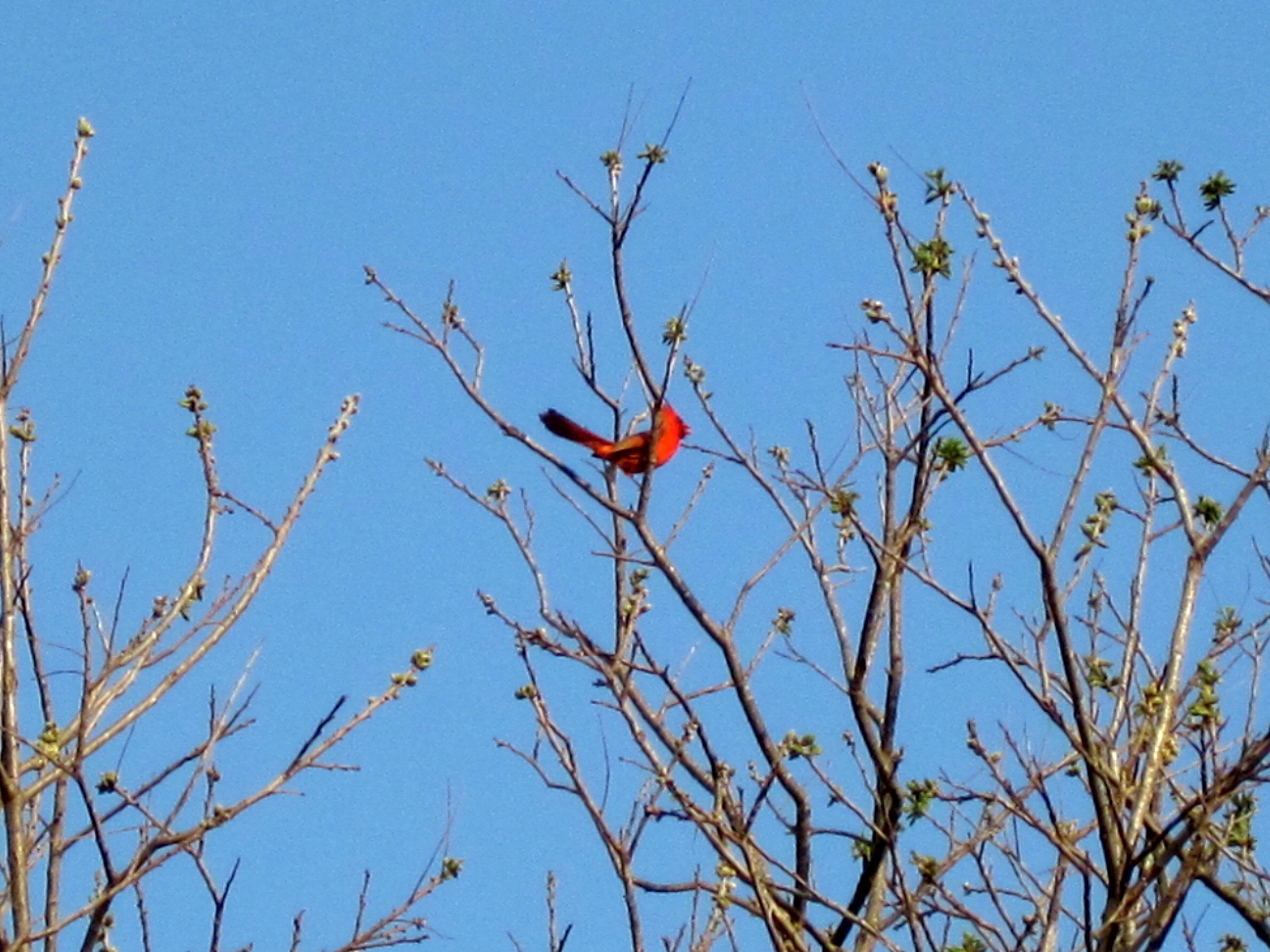 When out back for a walk around, I saw this cardinal perched in the top of one of the 40-50′ tall pecan trees that have just started to leaf out.