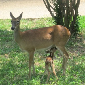 Early this afternoon I was standing in the kitchen and saw a deer about 10 feet from the house. I soon realized that she had a baby with her. I was able to get several shots from between the slats of the wooden blinds. The baby can’t be very old.