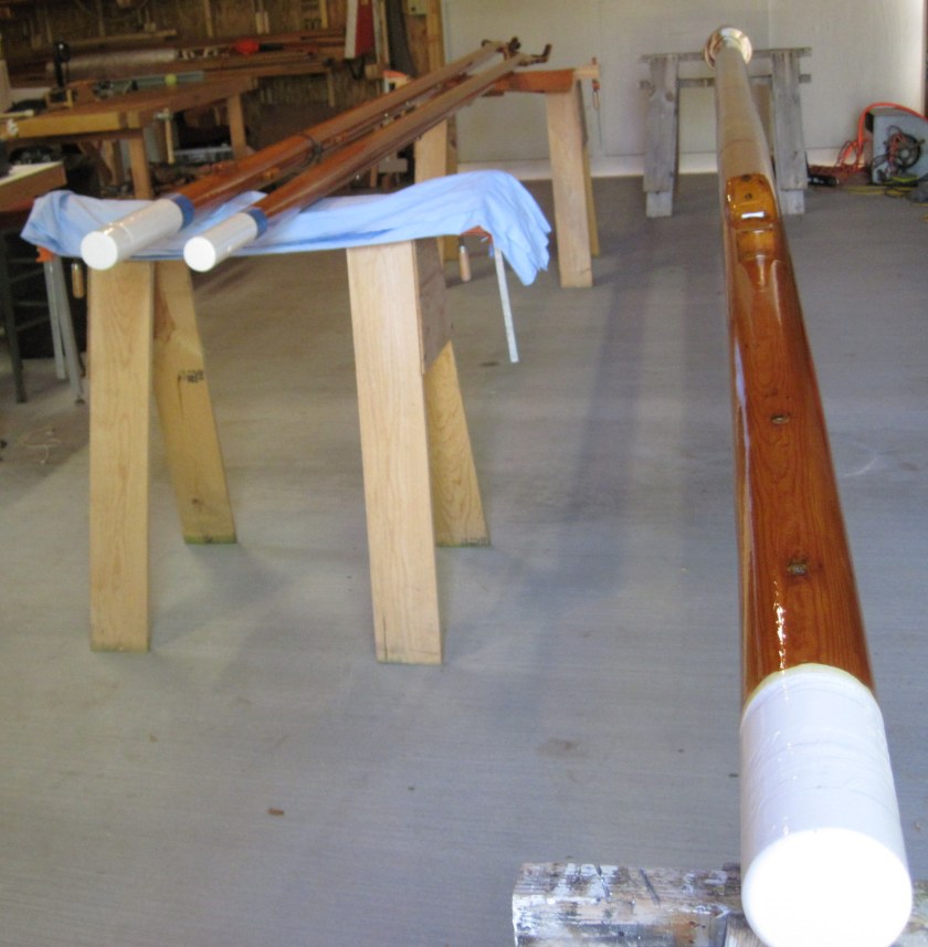 The masts and spars have gotten their last coat of varnish. Tonight, with the help of our friend, Marty, we rigged the mast and spars with the hoops, hardware, boom, gaff and flag halyards, forestay, and topping lift. She’s ready to step!