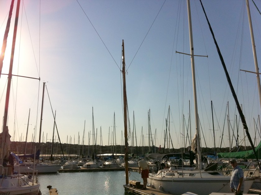 After work we headed out to the lake to step the mast (yay!).   Hard to believe we took the rig down just about 8 months ago.  Wow.   We had lots of great help from Marty, Joe, Kurt, Robert and Wiz.   We backed Dancer out of its slip and used the halyards from Prelude and Allegro to raise the mast up into the air over Kurt’s slip.  Then we moved Cupholder under the mast and lowered it into place.  It was over in no time!  I do love being on B-dock, we can do anything we set our minds to 🙂     Here is a shot of the mast being hoisted: