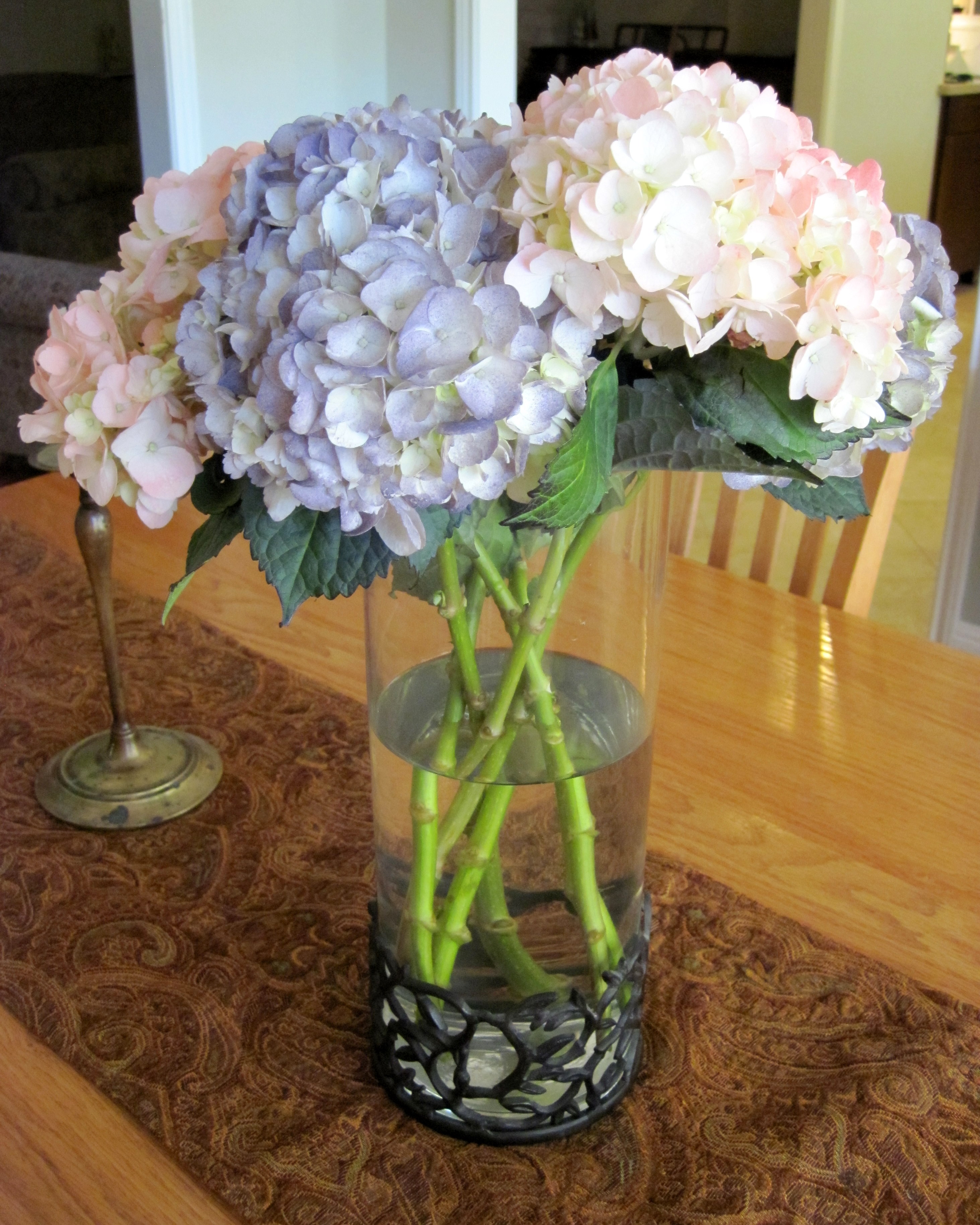 Well, that brings me back to the fresh flowers. I saw these hydrangeas yesterday at HEB and they seemed so pretty and soft and such a sharp contrast to what I see outside, I just had to bring a bunch home.
