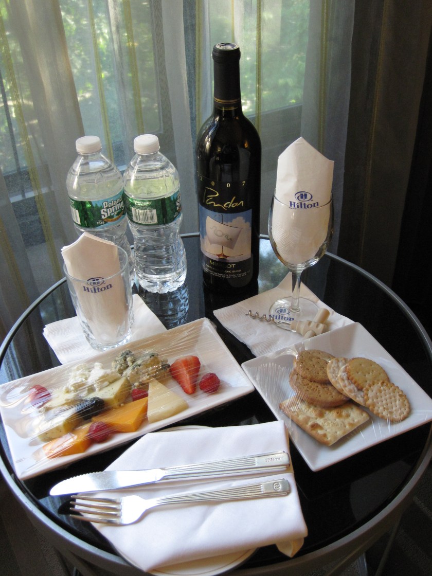 After schlepping my stuff to the new room, i was in business. About 30 minutes later a nice man from Room Service knocked on the door with this little tray of goodies from the Front Desk staff to make up for the inconvenience.