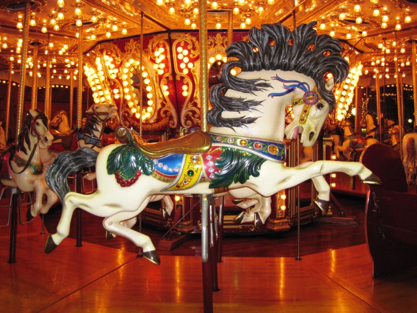 Afterwards we walked up and down the waterfront on the way back to the ferry.   The weather was great.  The first shot in this post is of one of the horses on an antique carousel inside of Miner’s Landing on Pier 57.