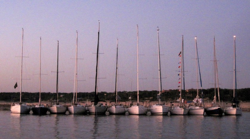 Let me see if I can do roll call….left to right, we had Mark & Sarah on Serenade, Gray & Debbie on the blue hulled First, Bartlett’s parents’ Catalina, John & Claudia & 2 others on the brand new Solace, Tasha & Robert and Tony & Michelle (visiting for the weekend!) on Voodoo, Danny & Casey on the Beneteau 31, Rory & Greg on Sapphire, Camden & Terry on MoonRock, Kurt, Wally & Kevin on Dancer, John & Deanna on Caribbean Run, Mike on Allegro, Lori & Dave on Camelot, Monte & me on Cupholder, and last but not least, Joe on Prelude.  Whew!