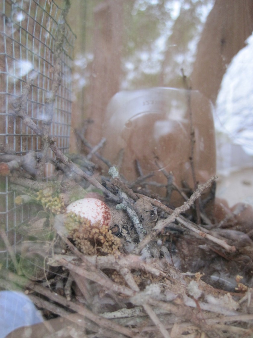 Well, I couldn’t help myself, so I finally peeked inside and saw a nest and an egg! My friend Doray said it could be a bewick wren, when I described the momma bird to her that has been keeping watch in the birdhouse and nearby. I looked it up online and sure enough, i think it is a bewick wren. Just one egg, though. But, I’m so excited to see a birdie in residence.
