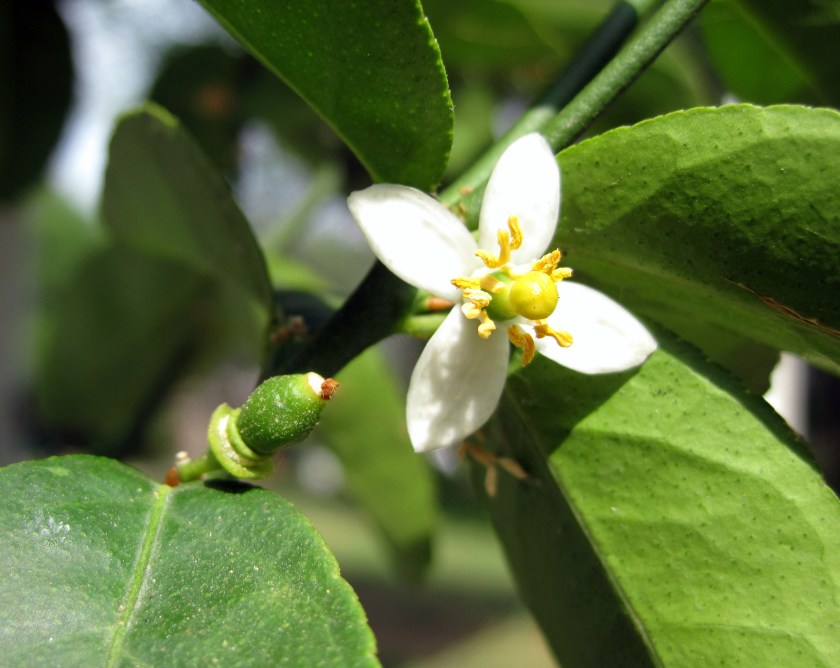 Doray & Tom gave Monte a lime tree for his birthday (aka his “margarita tree”).   It’s blooming out back, now.  And after the blooms are spent, little baby limes are left behind.