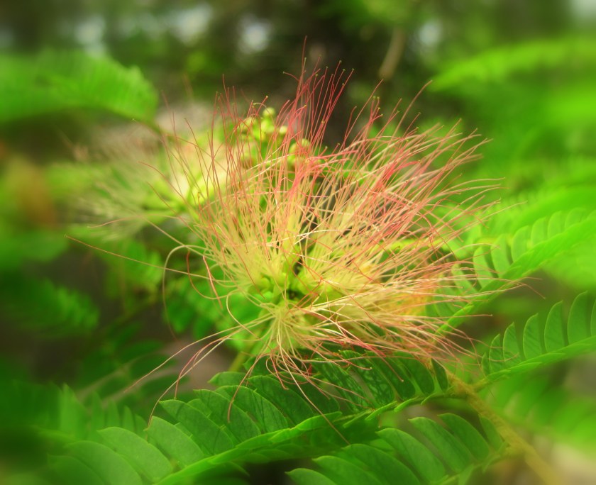 Our mimosa tree out back is blooming. It’s had a hard couple of years with freezes and droughts. At one point we thought it was a goner. It appeared to have a split in its trunk. But, there’s still life in it. The canopy is not covered with blooms this year, just a couple dozen. I tried to capture one of the newer ones, here.