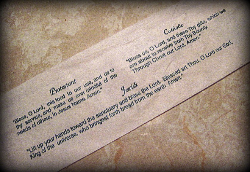Chuy’s uses those old timey wax paper sanitary wrappers for their silverware.  On the back they’ve printed multi-denomenational prayers of grace.   It seems so out of place in our world today.  But it’s a reminder for us to give thanks for what we have, and for what we are about to eat.