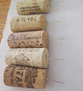 Stick a pin into each cork – get a good bite but leave as much of the pin hanging out as you can.