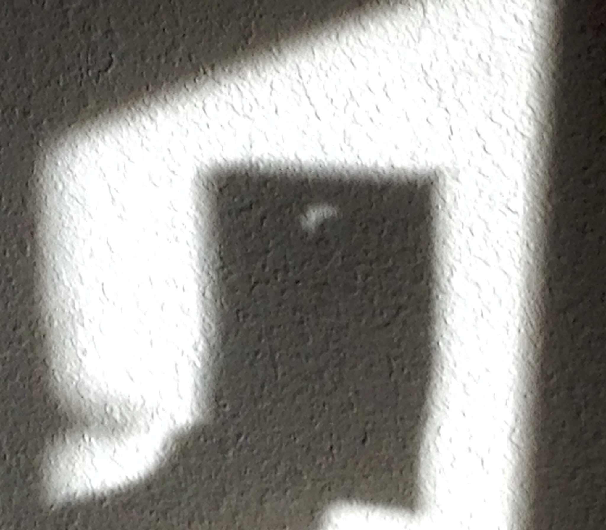 Crazy weather here. It rained and poured this morning. Then we had an hour or two of sunny blue sky, which afforded a glimpse of the partial solar eclipse through a hastily-made pinhole camera.
