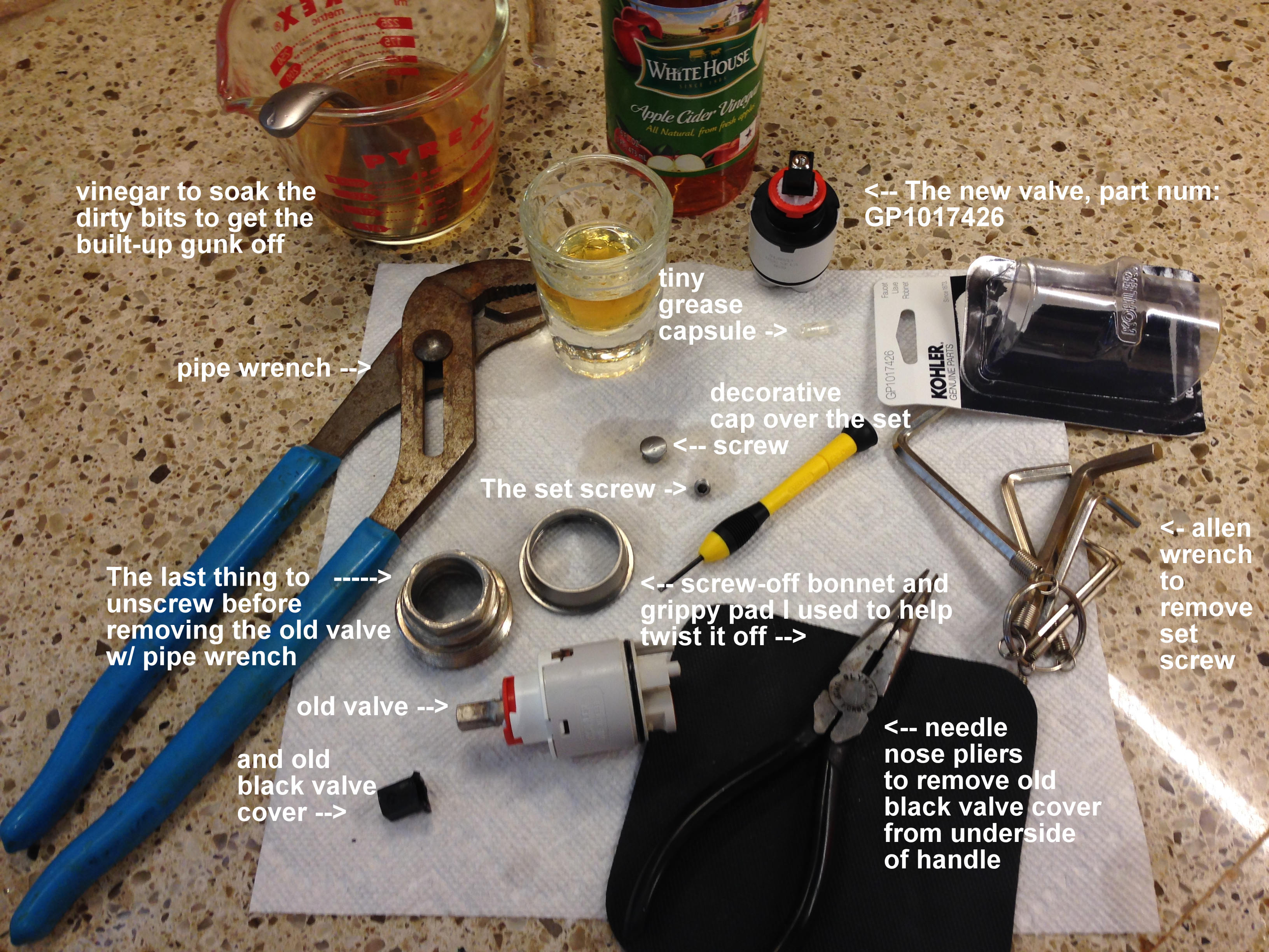 Google showed me that Kohler has really great documentation on how to fix this on their web pages here and even a short video here. And I eventually dug out and read the owner’s manual/guide that came with it – yes… i keep those things 🙂 I read about the Kohler Faucet lifetime warranty. You can read the fine print here, but Kohler basically says: “if the Faucet should leak or drip during normal use, Kohler Co. will, free of charge, mail to the purchaser the cartridge necessary to put the Faucet in good working condition.” Yes, free. I can’t believe anyone does that anymore.