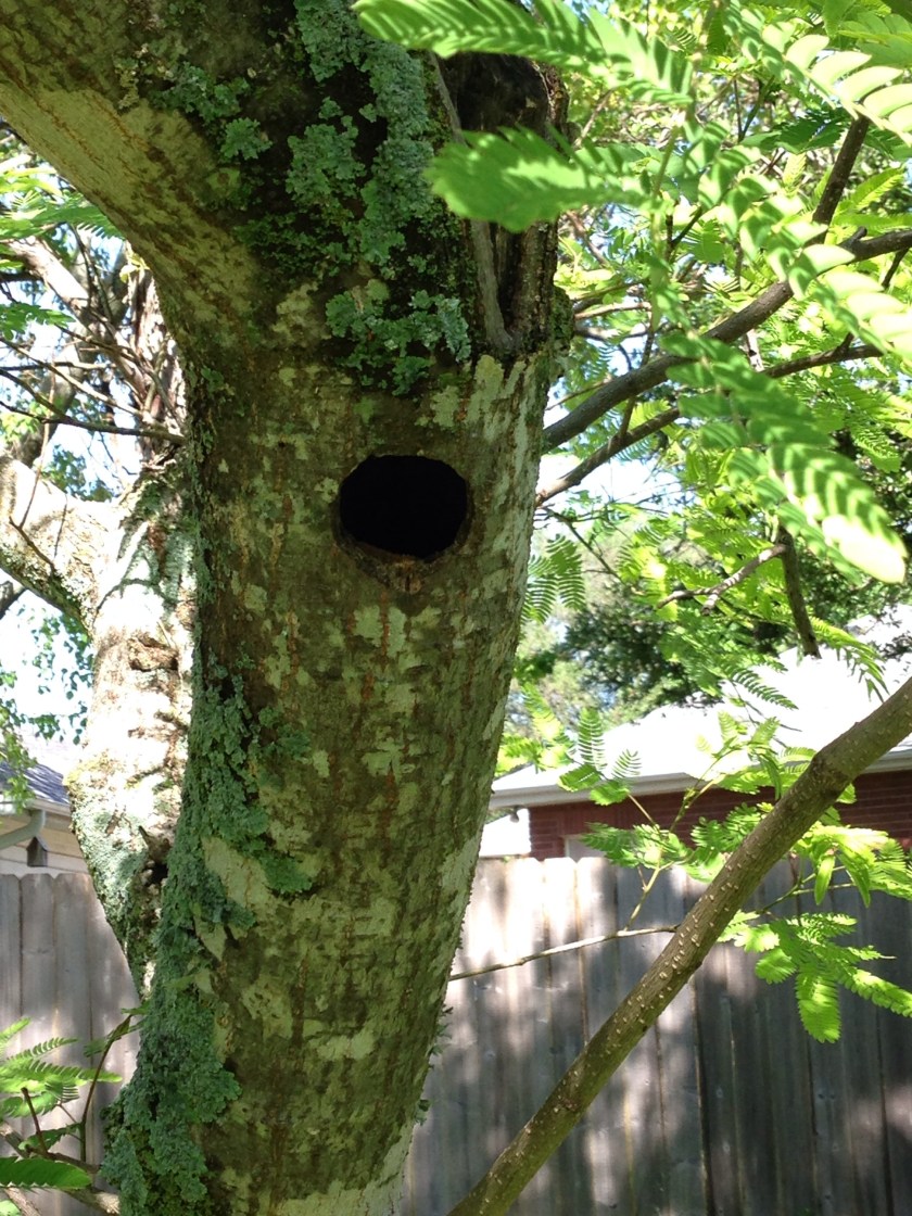 Today was a beautiful sunny Sunday. I spent the day gardening. On my way out back this morning, I noticed a bird fly out of our mimosa tree. On second look he really did fly out of the tree. Must be a woodpecker?