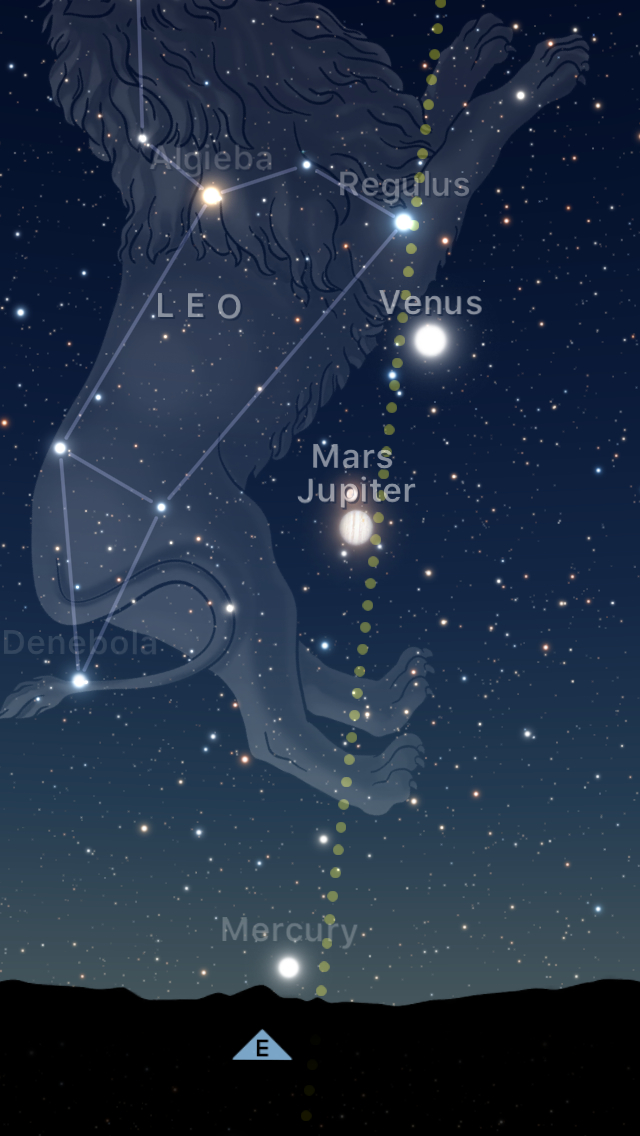 I fired up my Sky Guide iphone app to get my bearings. Venus is the one above, and Jupiter is the one below. I was disappointed to not be able to see Mars, which should have been just above Jupiter, but it must have been washed out by the light of Jupiter. Mercury had just risen but was too far below my view of the horizon.