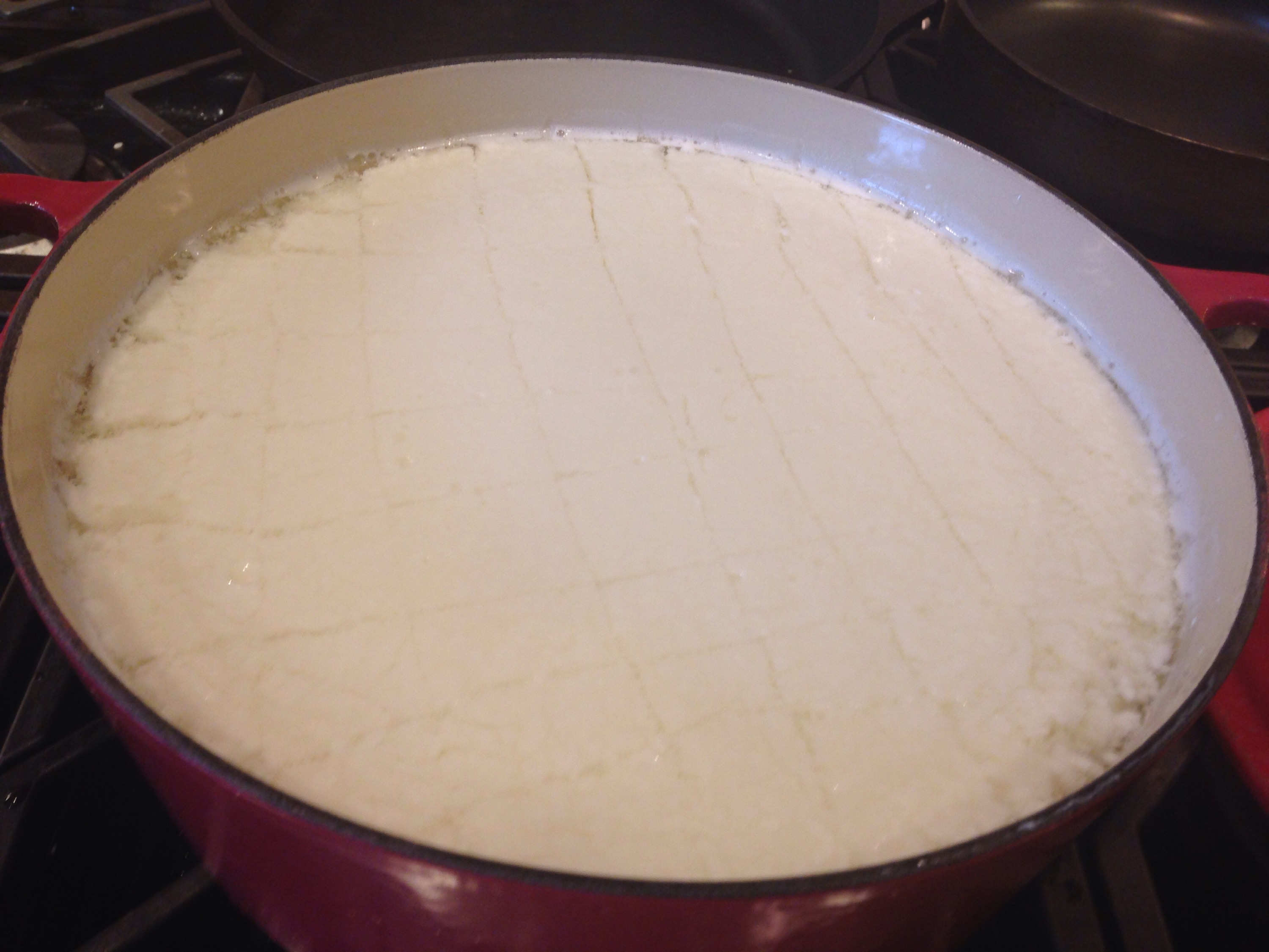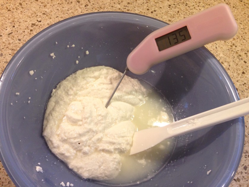 Raise heat, slowly, to 90 degrees Farenheit. Remove from heat. Add diluted rennet solution and stir, most lightly, for 30 seconds. Cover and don’t disturb for 5 minutes as the curd sets and starts to separate from the whey liquid. The consistency of curds you’re going for is soft tofu-ish. After 5 minutes, mine wasn’t very solidified, so I covered again and let sit for another 3 minutes.
