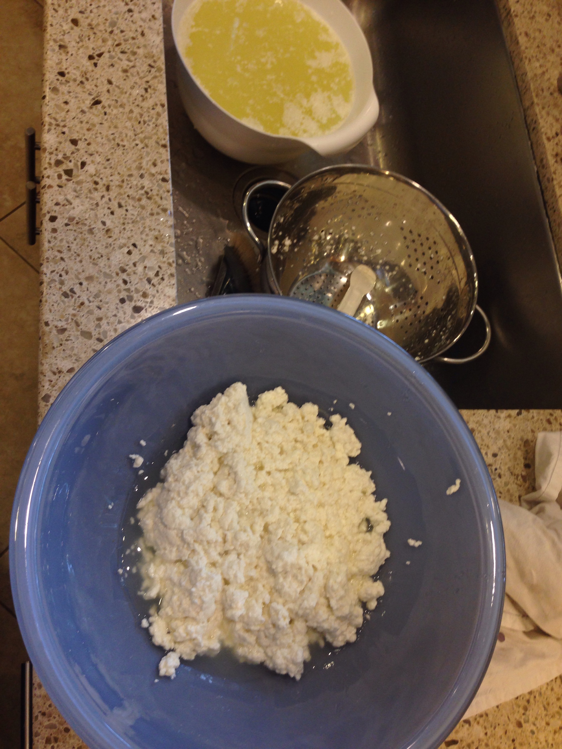 Separate curds from whey. I used a stainless steel colander on top of a large plastic bowl, and a stainless steel scoop. The picture below shows the remaining whey at the top, and the glass bowl of almost-mozzarella curds in a microwavable bowl at the bottom – ready for the next step.
