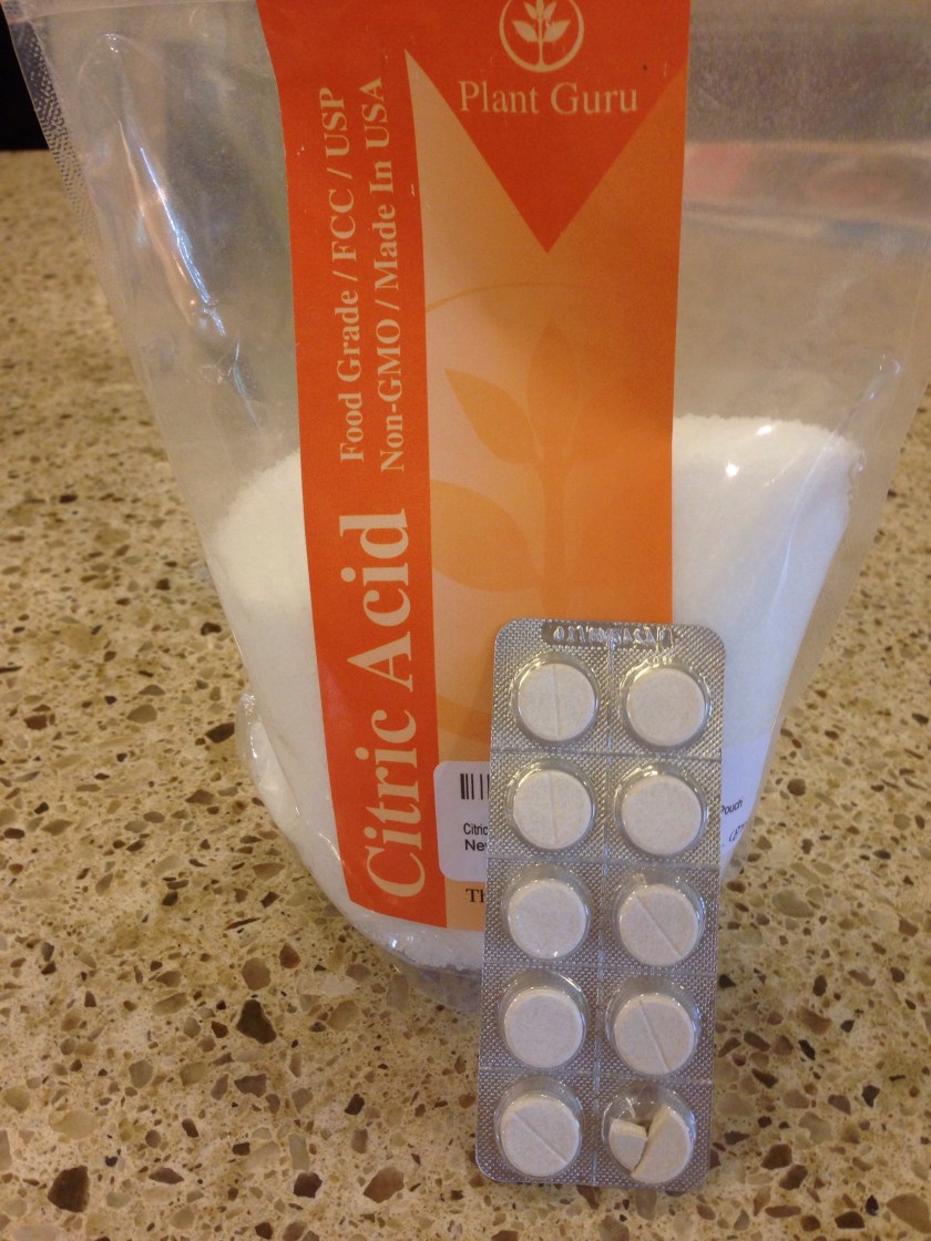 1 1/2 tsp citric acid powder dissolved in 1 cup of cold water. I used bottled spring water, since chlorinated water is a no-no. Set aside.