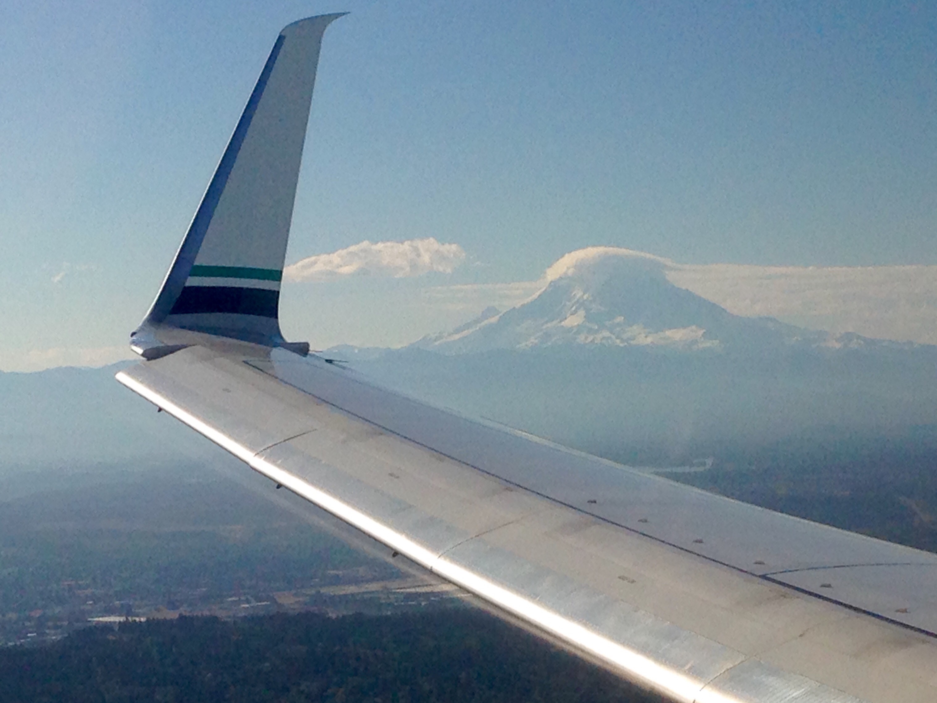 Mount Rainier flyby as seen through a window waaaay over on the other side of the plane.