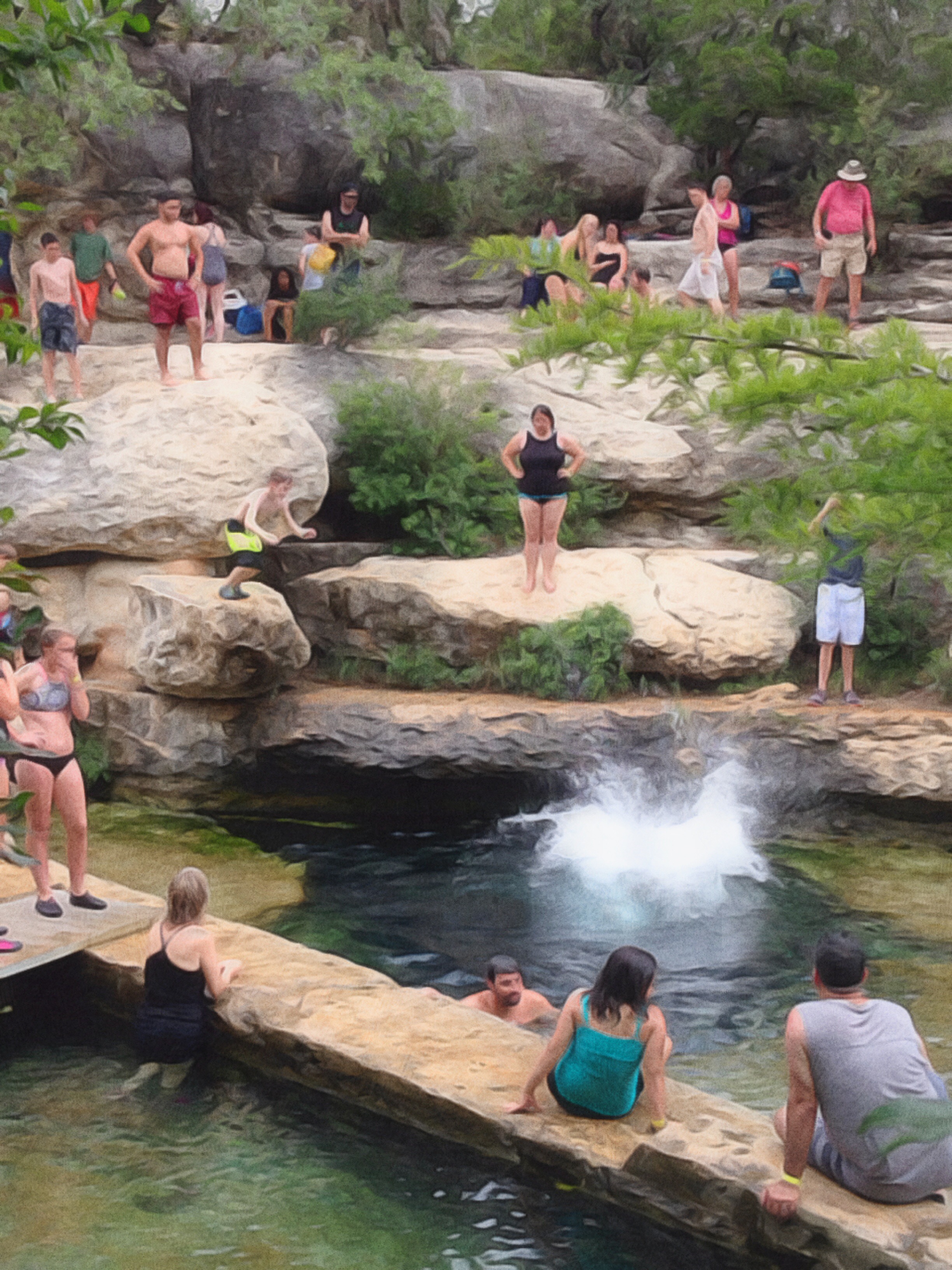 I joined Doray for a trip to the Wimberly area. We stopped by their new home site to check out progress. Then we visited Jacob’s Well Natural Area. Jacob’s Well is a narrow (10-20′ in diameter), but deep (up to 100′) hole in the limestone of the springfed Trinity Aquifer. Young and old jump from the rocks into the waters of the well to cool off. We were only hiking but I enjoyed watching the divers.