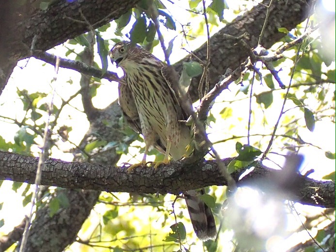 Since coming home from our road trip, I have noticed a marked decrease in my backyard birdie population. I suspected a hawk was the reason. And today, sure enough, while sitting out back I saw one swoop through the backyard scattering the few birds that were at the feeders. Later in the day, the hawk flew in again and perched on an oak across from me for a few minutes. It is huge. I believe this is a juvenile Cooper’s hawk. Cooper’s hawks and sharp-shinned hawks, both accipiters, are very hard to distinguish from one another. Based on field guidance I’ve read online (e.g., here, here, here and here), the overall size, head shape, tail shape, thick legs, and breast streaking lead me to lean towards a Cooper’s ID. Either way, it’s a beautiful bird, but I wish it would find another yard to terrorize. I miss my abundance of birdies.