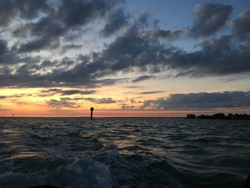 The next day we headed to Marathon for our first marina stay in a week. We stopped at Sombrero Reef Light for another nice afternoon snorkel. The Marathon Marina is nice. We stayed for two days and nights, full of boat work and provisioning. We did treat ourselves to a pub crawl the last night by dinghy to a couple places and were treated to yet another beautiful sunset.