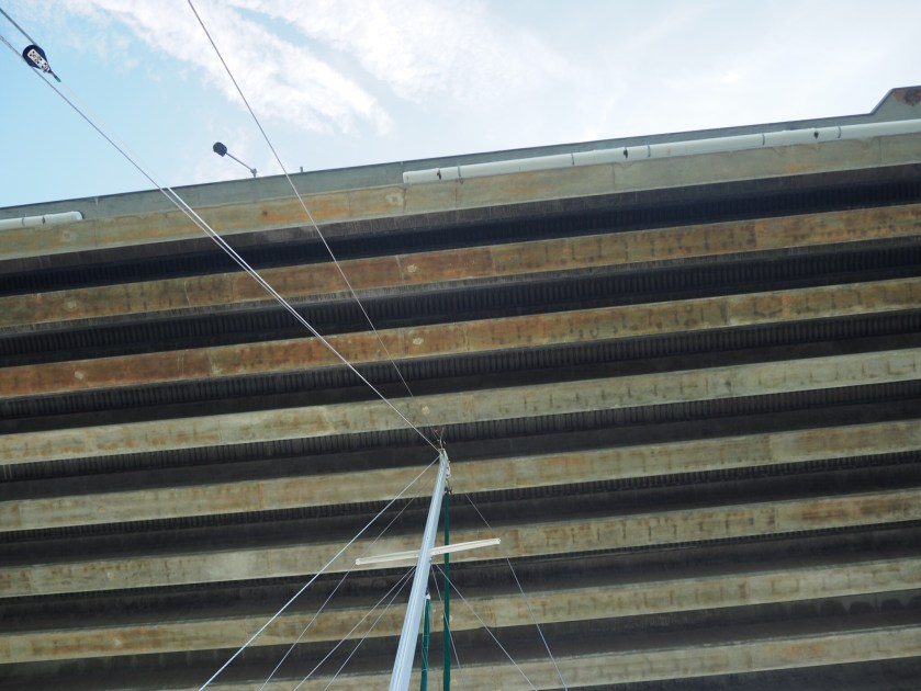 This is what a 63′ mast looks like when it passes under a 65′ bridge. Whoa, Nellie! This is why we have to time our arrival at bridges to be when it is NOT high tide.