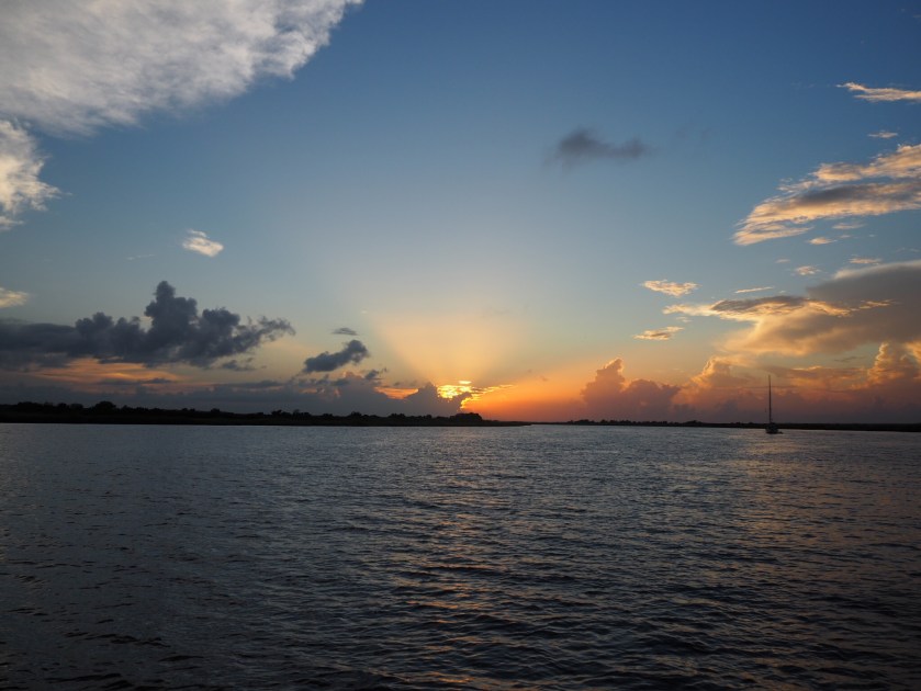 Day 1 – 4 bridges. 52 miles. We decided to go 10 miles farther than we’d planned today. We are anchored in the South Santee River for the night. There is one other sloop a couple hundred feet away, which is odd since we only passed one other sailboat all day.