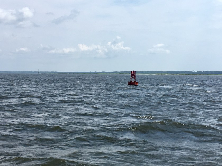 Day 4 – 2 bridges. 30 miles. We got off the dock easily this morning and headed on our way by 9AM. Every stretch of the ICW has been a little different each day. Today took us through the Cape Fear River. We had the tide against us for a couple hours and it was slow going through mostly sea-like conditions in the wide and deep shipping lanes.