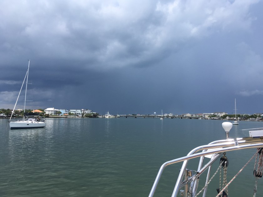 We pulled into Wrightsville just in time to get hit by our first thunderstorm/deluge as we were anchoring. Not bad. I’ll take it.