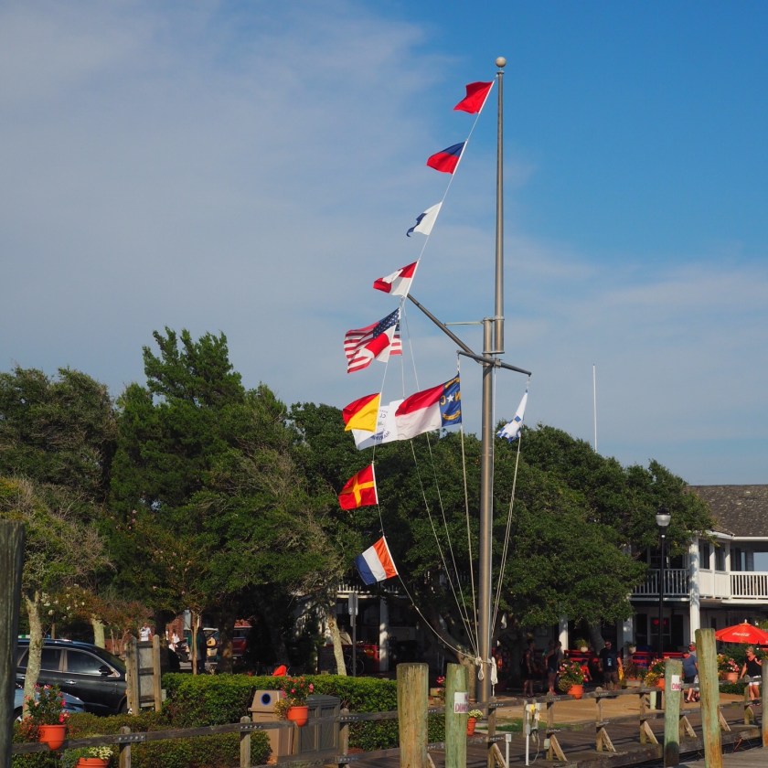 Day 8 – 3 bridges. 22 miles. We finished up last-minute chores this morning, and left the slip at slack tide, around 2pm. Goodbye Beaufort! The string of signal flags on the flagpole at Beaufort Docks Marina spell out B-E-A-U-F-O-R-T. 🙂