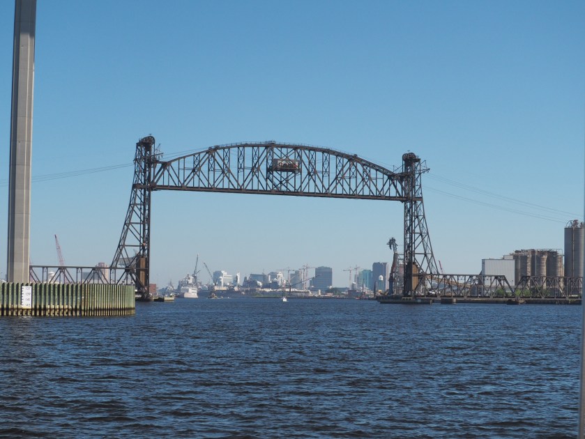 All the other bridges are either fixed or are usually in the open position; even the bridge that delayed our arrival.  Below, you can see Norfolk beyond the formerly broken bridge.