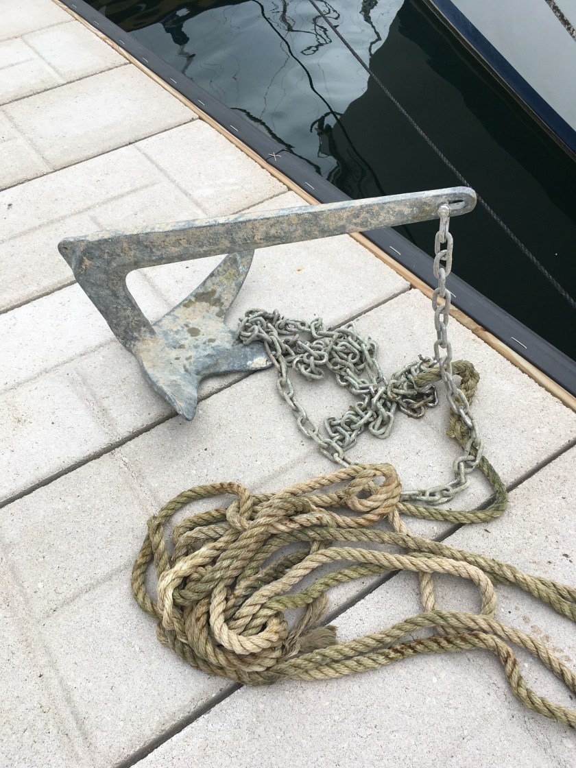 Monte and I spent a couple nights at anchor on the lake this week. We chose to avoid the wake-heavy holiday weekend. It was hazy, I guess from the Saharan dust remnants in the air. But it was lovely. Keeto enjoyed it, too. We’ve launched the kayak for the summer, so I have resumed my treasure-hunt-paddling around the coves. I was rewarded yesterday with this long lost 11 lb. Lewmar claw anchor and stainless steel tackle that someone had to cut loose at some point months ago when the lake was much higher.