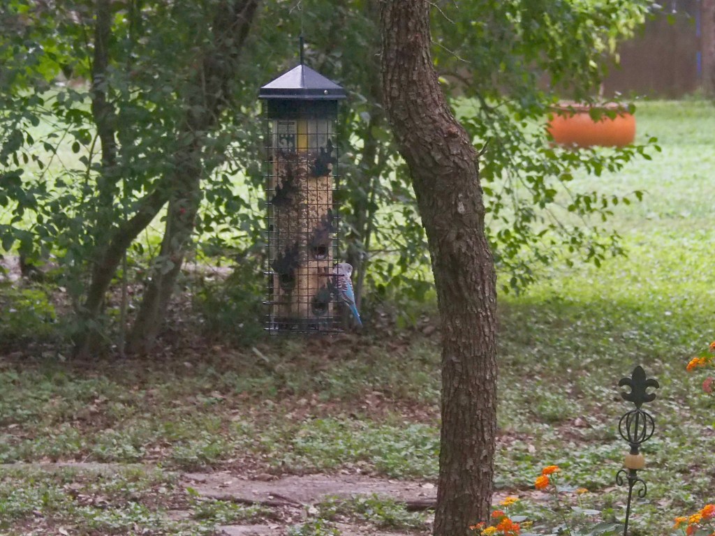 After a hard afternoon of yard work on Friday, Monte and I were sitting on the back patio enjoying a brewski. Keeto was out there with us in his cage (sans brewski). I caught a flash of blue at the bird feeder. It was a budgie! And a blue one at that.