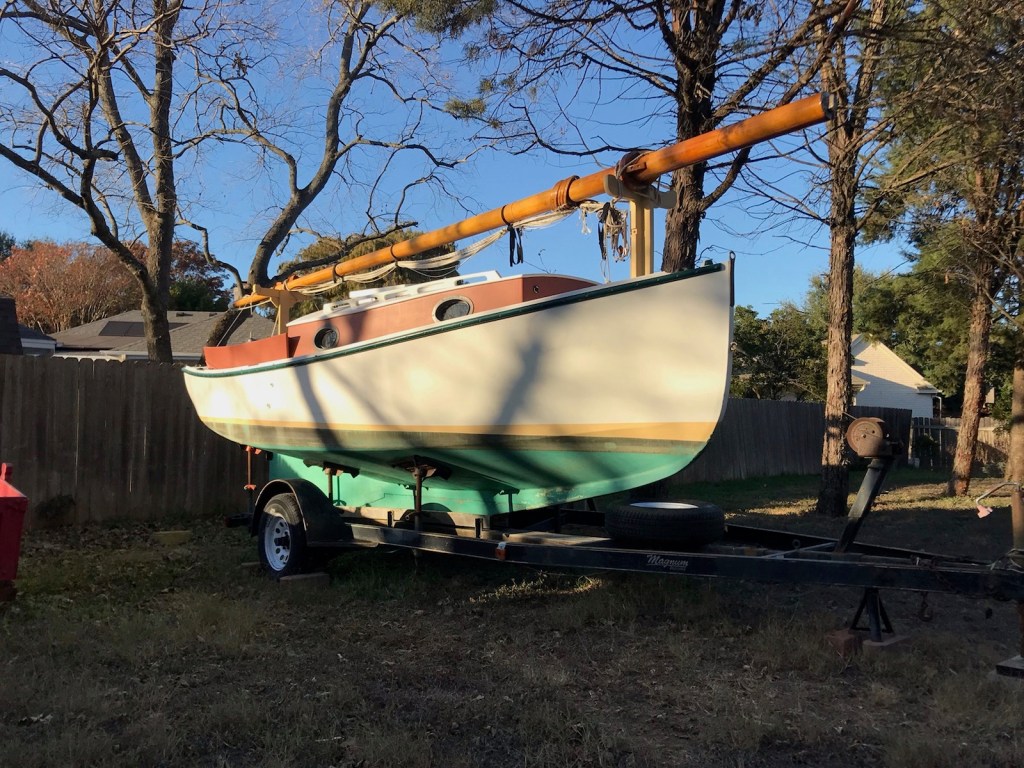 After sailing Cupholder down to the marina on Sunday, Monte spent the next few days taking the rigging, booms, and mast down. Today we met Marty at the marina and we put Cupholder on the trailer and brought her home. Many, many thanks to Marty for his help and guidance as we worked to get the boat on the trailer properly. And thanks to Sue for the use of the 4Runner to do the hard work. We couldn’t have done it without you.