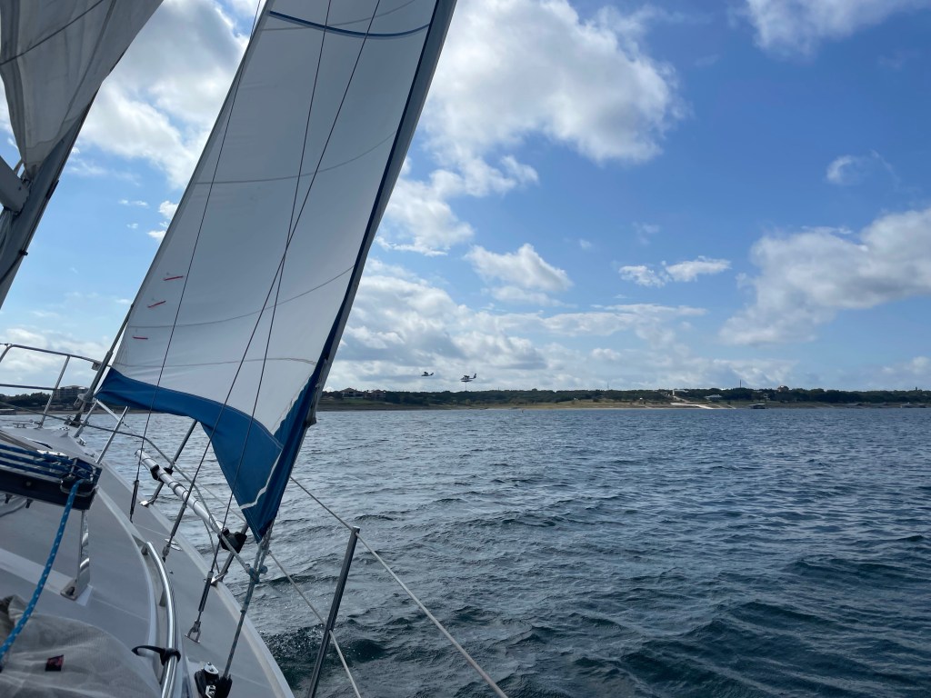 Today, the crew of Camelot fought back in a tightly run race. We had a hard day yesterday in high winds, overpowered with the whomper foresail. It whomped the grinders for sure. We came in third in the long upstream there-and-back race to Lakeway.
