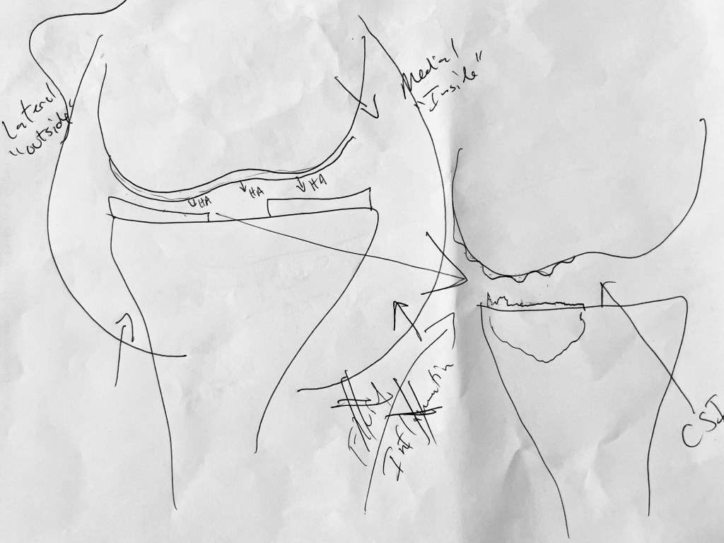 This is the actual dumbed-down drawing he made to illustrate for me what an ideal, ‘healthy’ knee should look like on the left, compared to the current situation in my knee on the right. I was initially taken aback by the jagged, bumpy, withering bits on the right vs the bit on the left. Not ideal. And, apparently, it’s not going to get any better. I have an angry knee.