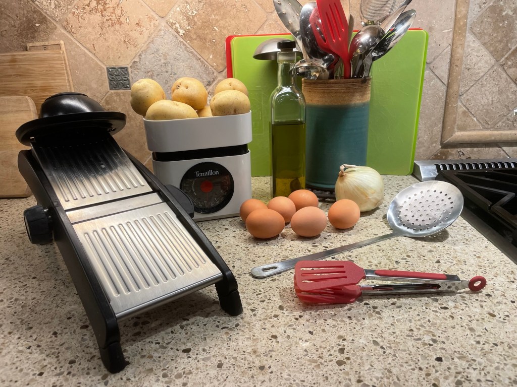– Two 10″ skillets, one without non-stick (for the cooking of the onions, and the preparation of the potatoes) and one with non-stick (for the actual cooking of the tortilla after all the ingredients have been prepared). You can probably get away with one, but if you plan to make more than one tortilla, having two skillets allows you to overlap some steps.