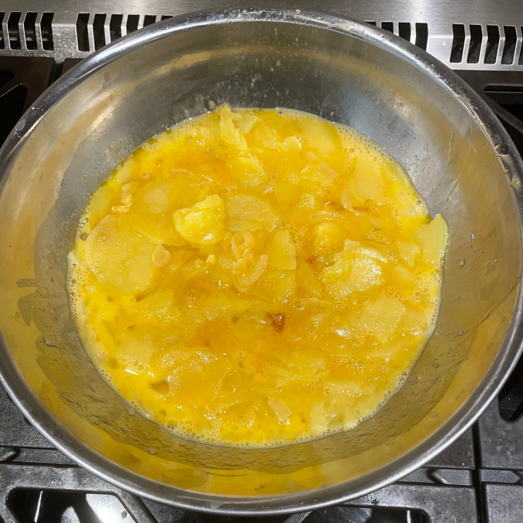 The egg, cooked potatoes, and onion mixture