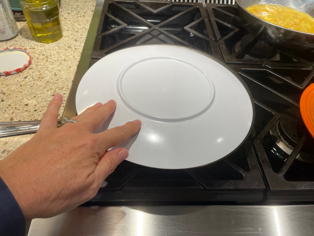 – A mostly flat plate, a little bigger than the top of your skillet, used to flip the tortilla. You don’t want a lip on the edge of the plate, as you want to be able to slide the tortilla from plate to pan easily.