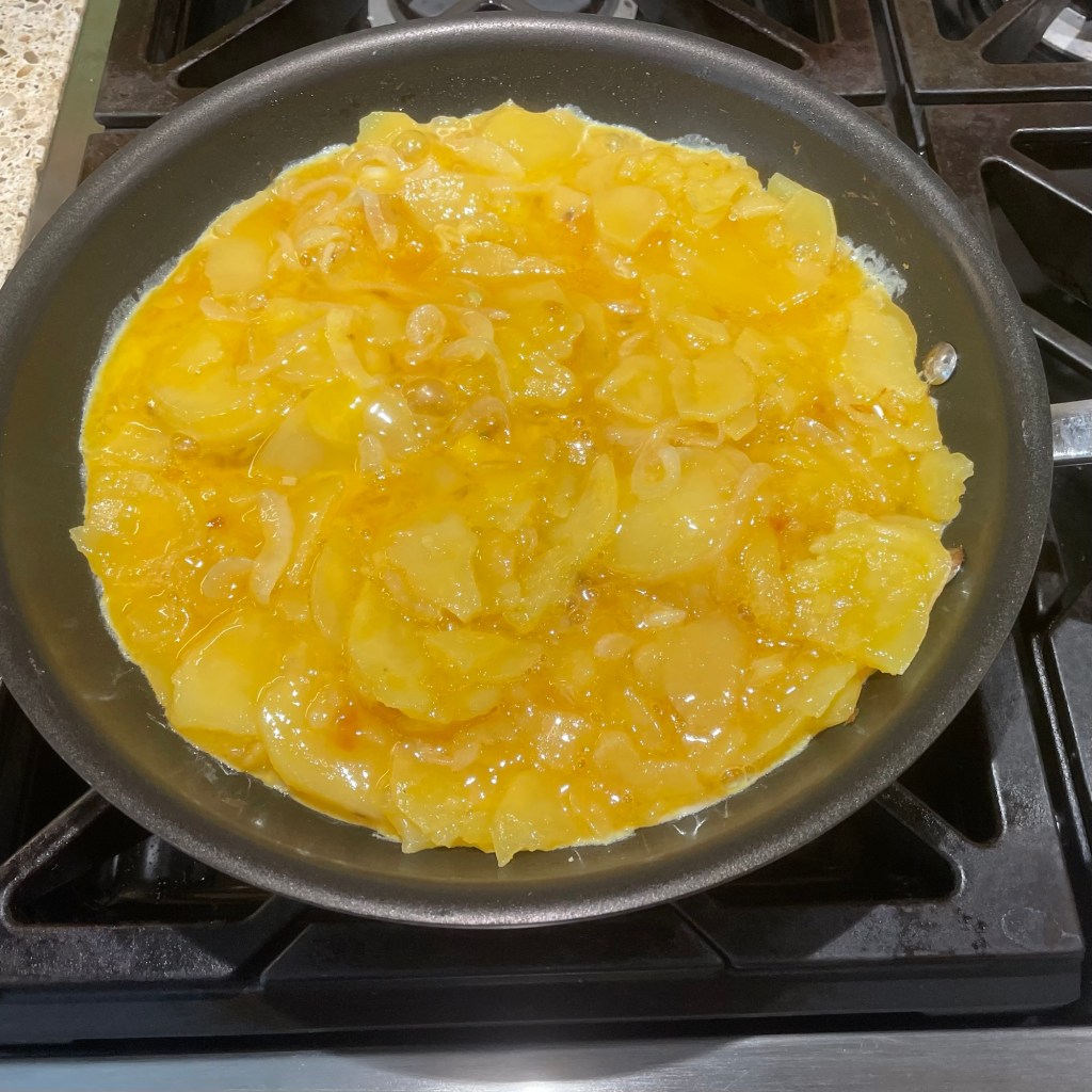 Add about 1 1/2 cups of olive oil into skillet, and heat on medium-low until oil is shimmery, but not boiling. We are not frying the potatoes in the oil, we are poaching them til they are tender. When the oil is hot, add a slice or two of potato to see if the temperature is right. You don’t want it to fry like a McDonald’s french fry. Sizzle is ok. If it looks right, add the potatoes. Make sure that you have plenty of room above the potatoes in the skillet so as to not overflow the oil when flipping the potatoes. If not, you probably have too many potatoes. Add oil, if necessary, to cover the top of the potatoes.