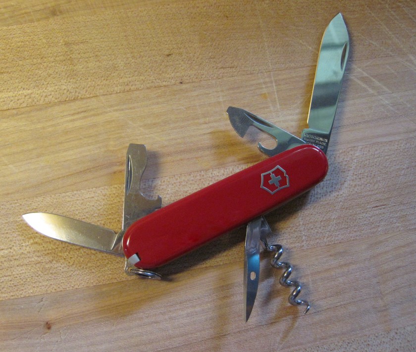 One of Monte’s vast array of swiss army knives is missing. Probably in a bilge, or perhaps at the bottom of a cove. So we ordered another, which arrived today. Did you know that there are about 100 different models of swiss army knives, with different combos and numbers of gadgets attached? This one is called The Tourist. Upon opening the box, Monte declared it the “perfect” swiss army knife. So, go get you one!