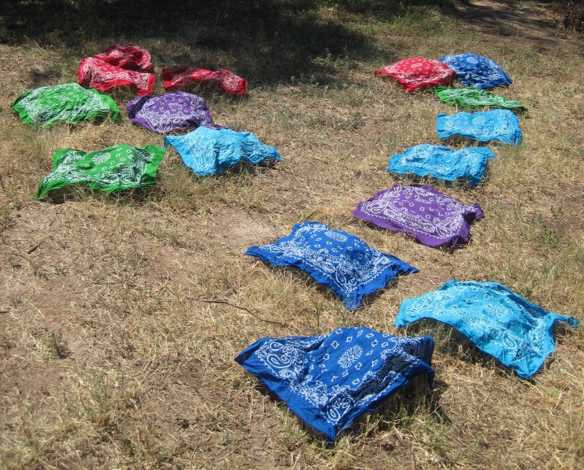 The story behind the shot: Monte is very fond of colored bandanas / hankies, and won’t get dressed without having one or two of these in his pocket. He uses them for pretty much everything. Well, last weekend he declared that he was running low and came back from a shopping run with a couple dozen bright, crisp, new colored bandanas. They bleed profusely, though for the first 5 – 10 washes. So he’s taken to washing them in a bucket of saltwater to set the colors. This is apparently the drying cycle for the latest batch. 🙂