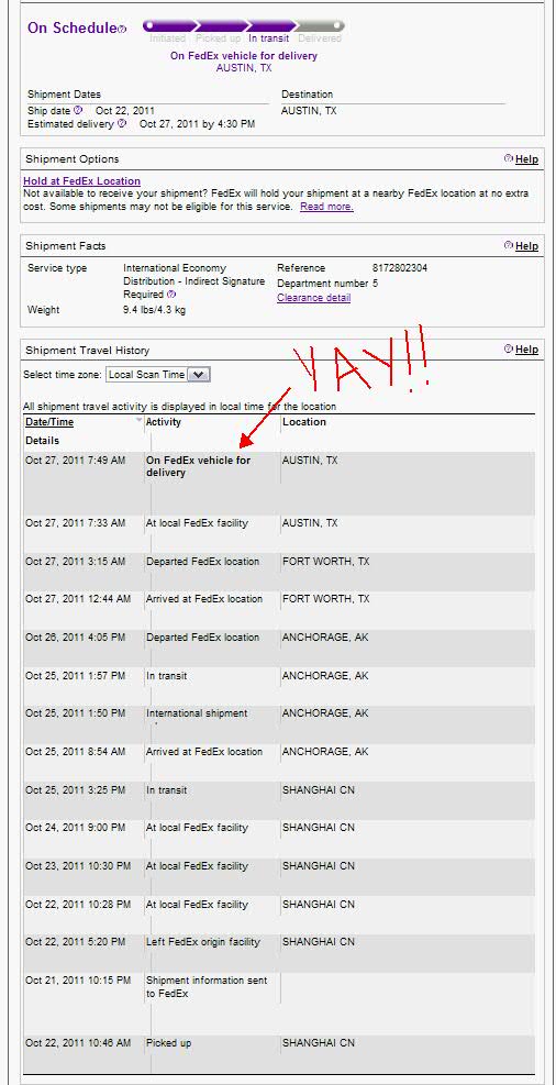 Soooo, i did. And i’ve been (not) patiently waiting for it to be delivered for over a week. The target delivery date was today. The nice people at Apple sent me the tracking info so that I could watch the progress of my new toy make its way from China to my front door via FedEx. That means with the click of a mouse I can go out to FedEx and see the status of my package delivery… which I’ve done about 10 times a day since last week! The package was picked up by Fed Ex and then sat at the FedEx place in Shanghai for about 3 1/2 days… excruciating!… and then when it finally got to the continent, it sat in Anchorage for over a day. Ugh! Well, as of this morning it is in Austin, on a truck, out for delivery (YAY!).
