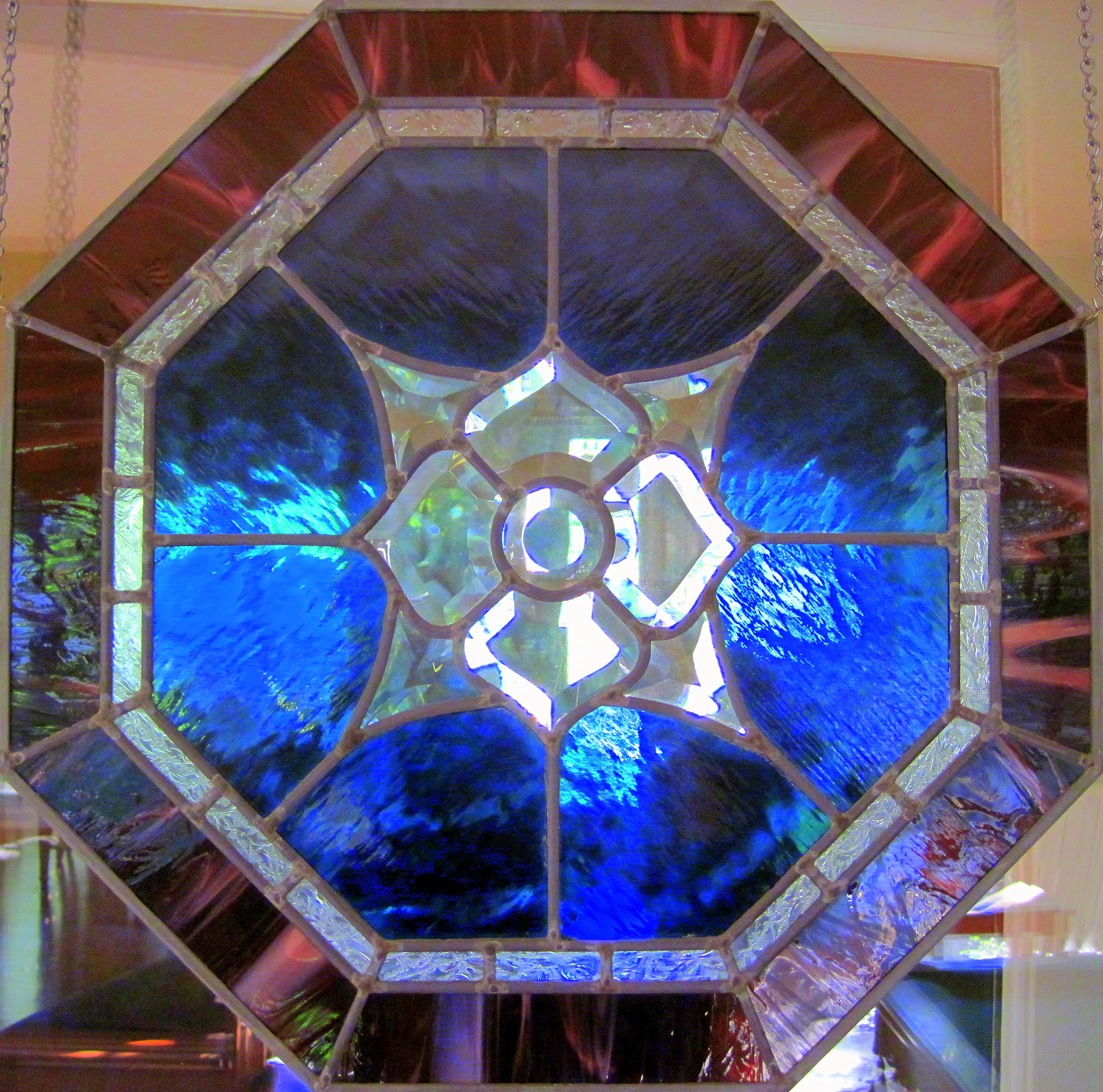 No special reason for this shot today. I simply noticed some light reflecting off this hanging glass panel when I walked through the room…. so it caught my eye. I would love to learn how to work with stained glass one day. This is a piece that I bought on one of my Pecan Street Festival excursions many years ago — and still enjoying it.